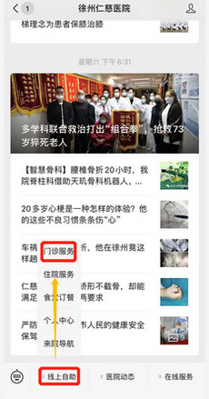 2、進(jìn)入公眾號(hào),點(diǎn)擊線上自助→門診服務(wù)。