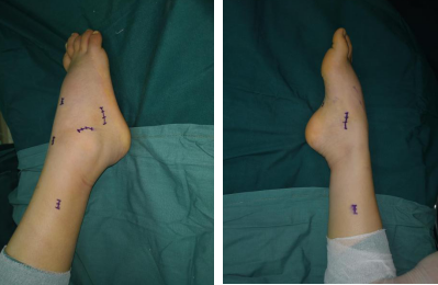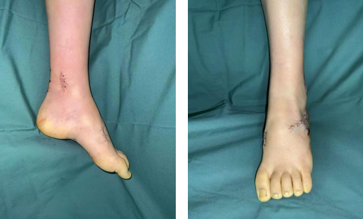 第二天,曹廣超手術(shù)團(tuán)隊(duì)為周周制定了個(gè)性化的手術(shù)方案,先為她進(jìn)行了“右馬蹄高弓內(nèi)翻足畸形矯正術(shù)”,術(shù)中進(jìn)行跟腱、跖筋膜松解延長(zhǎng),第1趾骨截骨內(nèi)固定,脛骨后肌轉(zhuǎn)位,腓骨長(zhǎng)肌松解延長(zhǎng),腓骨短肌加強(qiáng)等操作,手術(shù)順利。術(shù)后2個(gè)月,周周開(kāi)始進(jìn)行康復(fù)訓(xùn)練,等術(shù)后4個(gè)月時(shí)已經(jīng)能夠下地正常行走了。