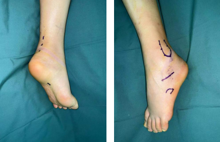 2022年1月,父母帶著周周再次來(lái)院,希望曹主任手術(shù)團(tuán)隊(duì)為女兒進(jìn)行左足的矯形手術(shù)。曹廣超、李亮、王巖巖手術(shù)團(tuán)隊(duì)為周周進(jìn)行了“左馬蹄高弓內(nèi)翻足畸形矯正術(shù)”。因周周雙足情況不同,本次手術(shù)主要進(jìn)行跟腱、跖筋膜脛骨、脛骨后肌、趾長(zhǎng)伸肌延長(zhǎng),第1趾骨抬高,趾長(zhǎng)伸轉(zhuǎn)位,腓骨肌加強(qiáng)等操作。